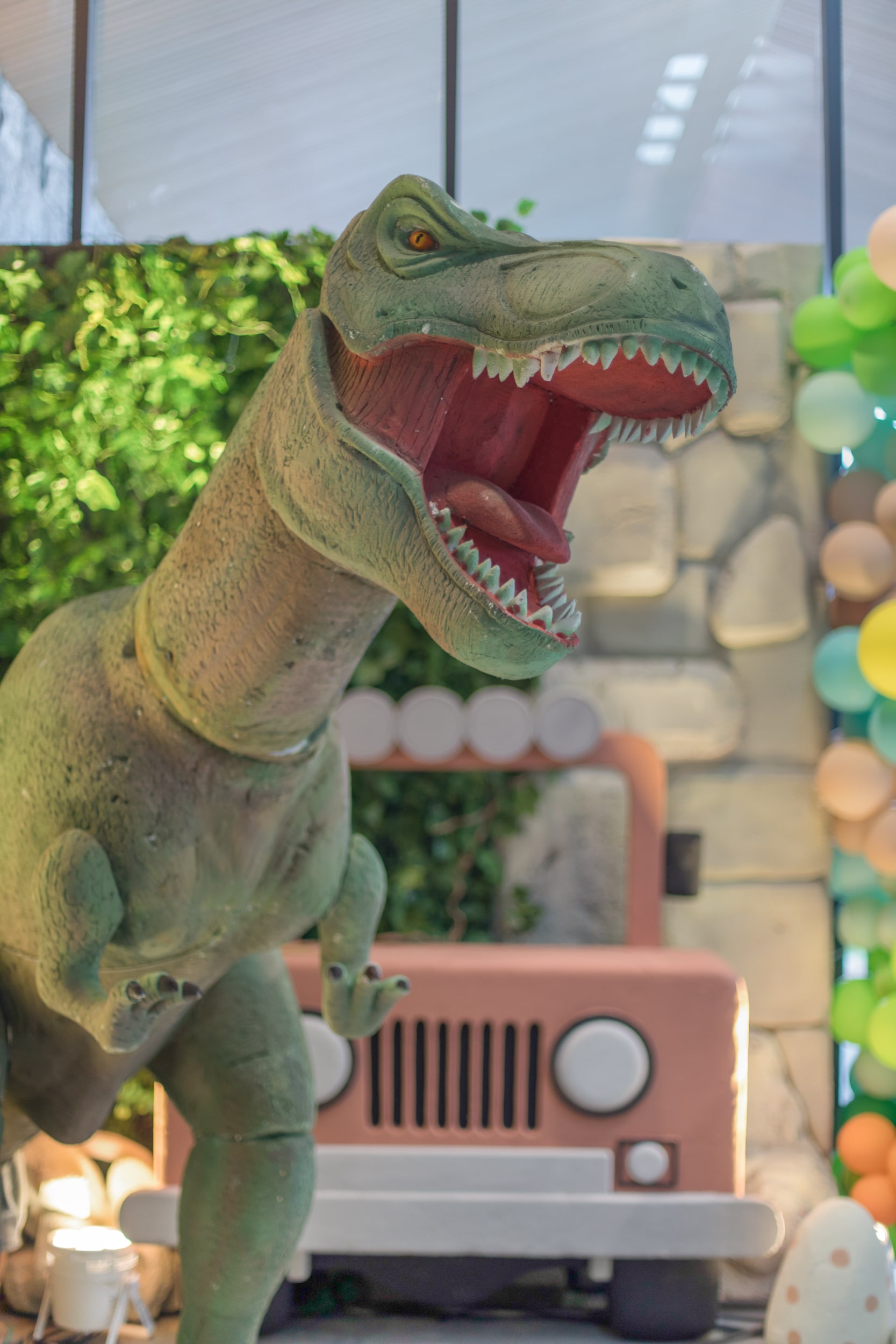 Then came the photo corner—the place where imaginations collided with adrenaline. There stood a towering T-Rex, massive and roaring, frozen mid-snarl with its jaws stretched wide as if ready to swallow anything in its path. Guests approached cautiously at first, walking the fine line between awe and playful fear. Children squealed, adults laughed nervously, and everyone walked away with photos that looked more like stills from a blockbuster film than snapshots from a birthday party.