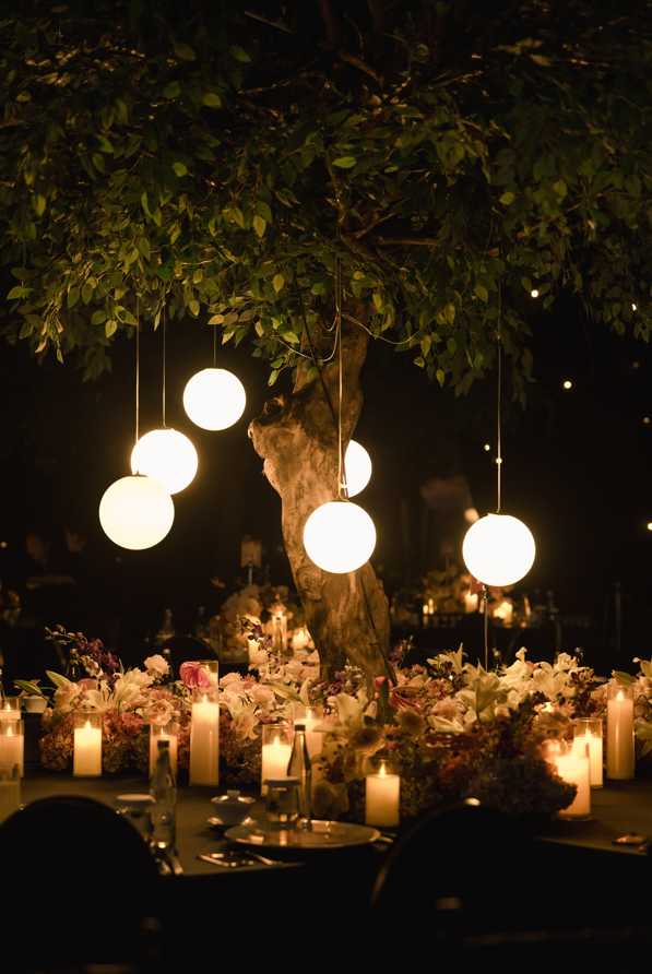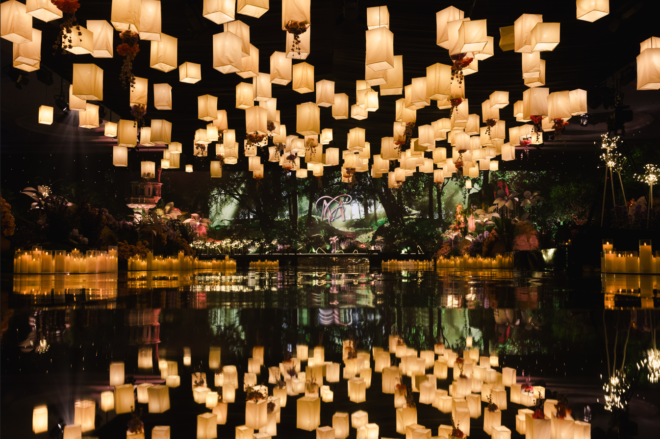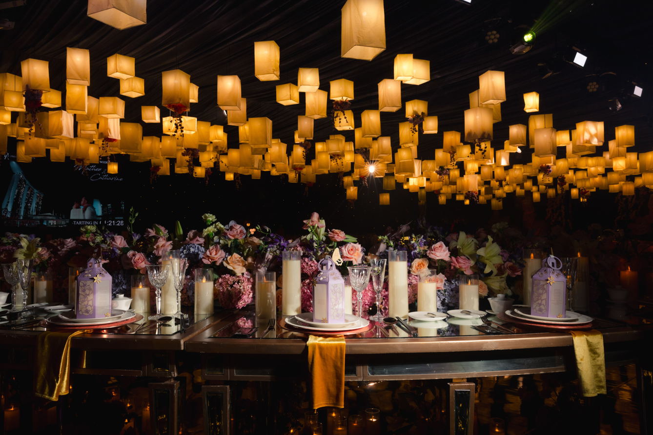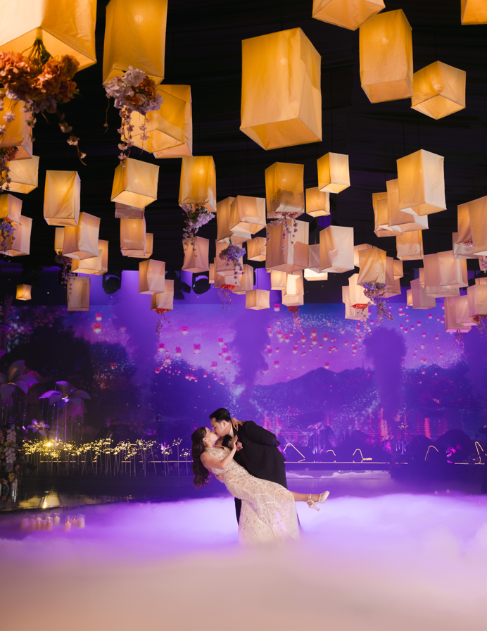 But the enchantment didn’t end there. Matheo and Catharine had prepared a first dance that was more than a performance — it was a love letter in motion. As the opening lines of “I See the Light” began, they sang the duet live, their voices weaving together just as their lives had. The dance that followed felt intimate yet cinematic, glowing with the kind of sincerity that only comes from two people who truly see each other. The room fell into a hush, every eye drawn to the couple as they moved beneath a canopy of soft illumination that echoed the floating lanterns of their inspiration.